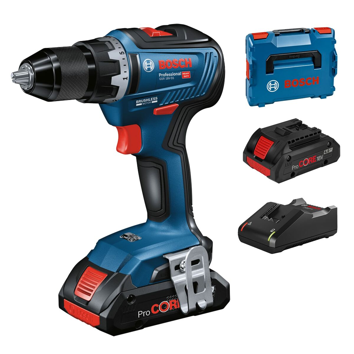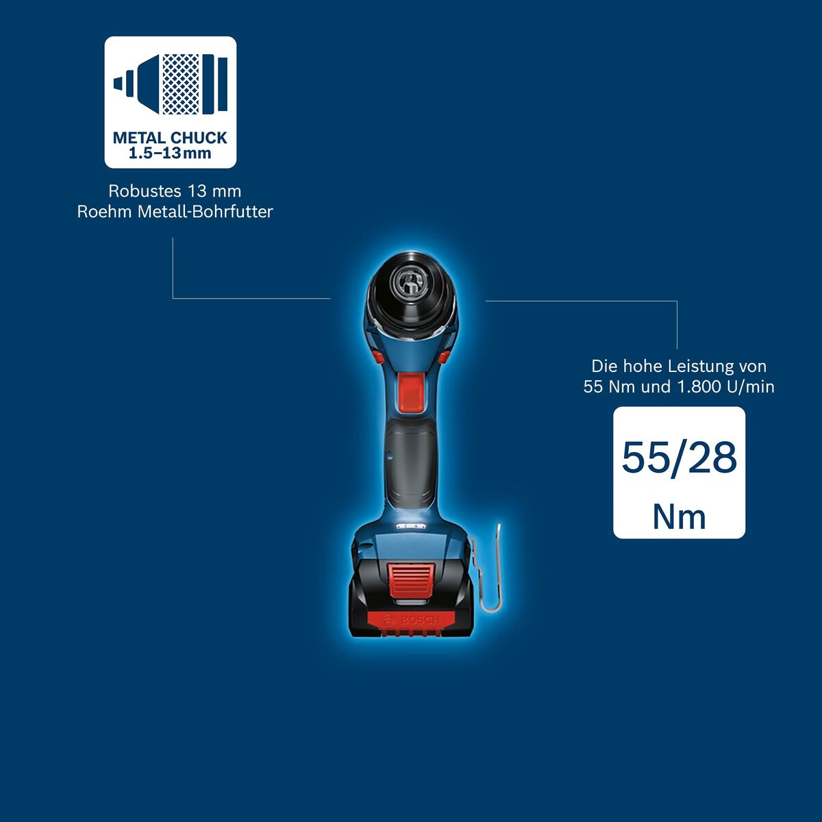 Bosch GSR 18V-55 Professional - Bohrer/Schrauber - schnurlos. Tipo de producto: Destornillador eléctrico, Forma del mango: Mango de pistola, Color del producto: Negro, Azul. Velocidad de giro al ralentí (máx.): 1800 RPM, Velocidad de giro al ralentí (mín.): 460 RPM, Par de torsión (mín.): 28 Nm. Fuente de energía: Batería, Voltaje de la pila: 18 V, Tecnología de batería: Ión de litio. Ancho: 78 mm, Profundidad: 179 mm, Altura: 207 mm. Número de baterías incluidas: 1 pieza(s)