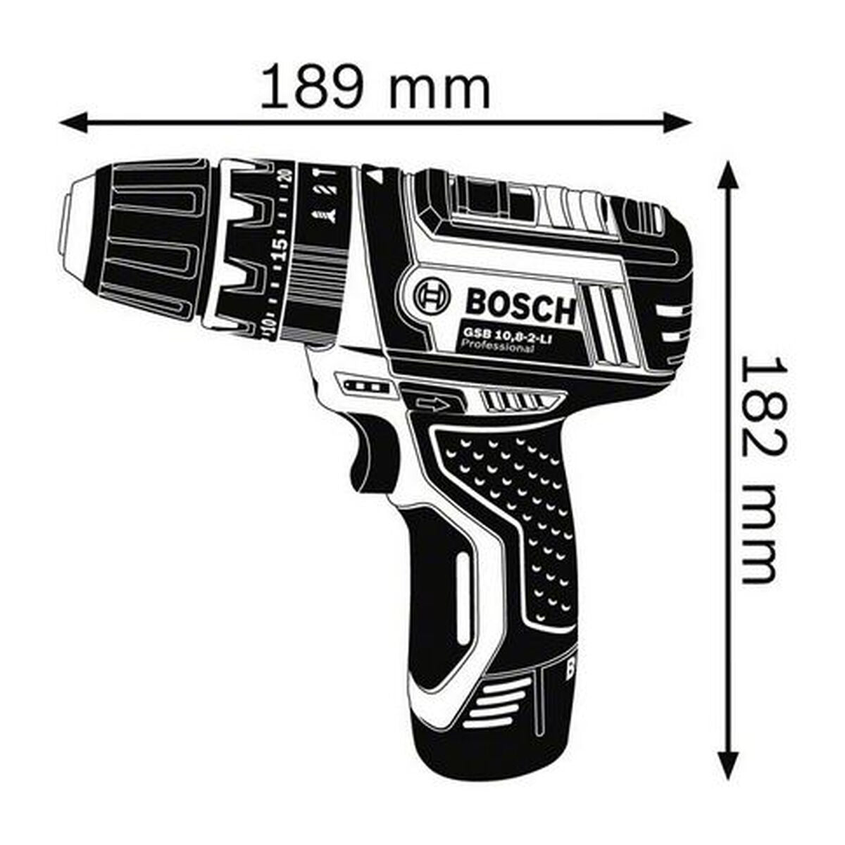 Bosch GSB 10,8-2-LI Professional. Diseño de producto: Taladro de pistola, Tipo de broca: Sin llave, Color del producto: Negro, Azul, Rojo. Capacidad de sujección (max): 1 cm, Diámetro de perforación en madera (max): 1,9 cm, Diámetro de perforación en acero (max): 1 cm. Fuente de energía: Batería, Voltaje de la pila: 10,8 V. Emisión de la vibración: 10,5 m/s²