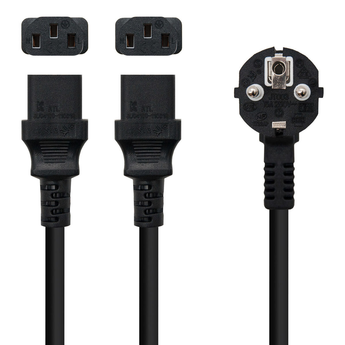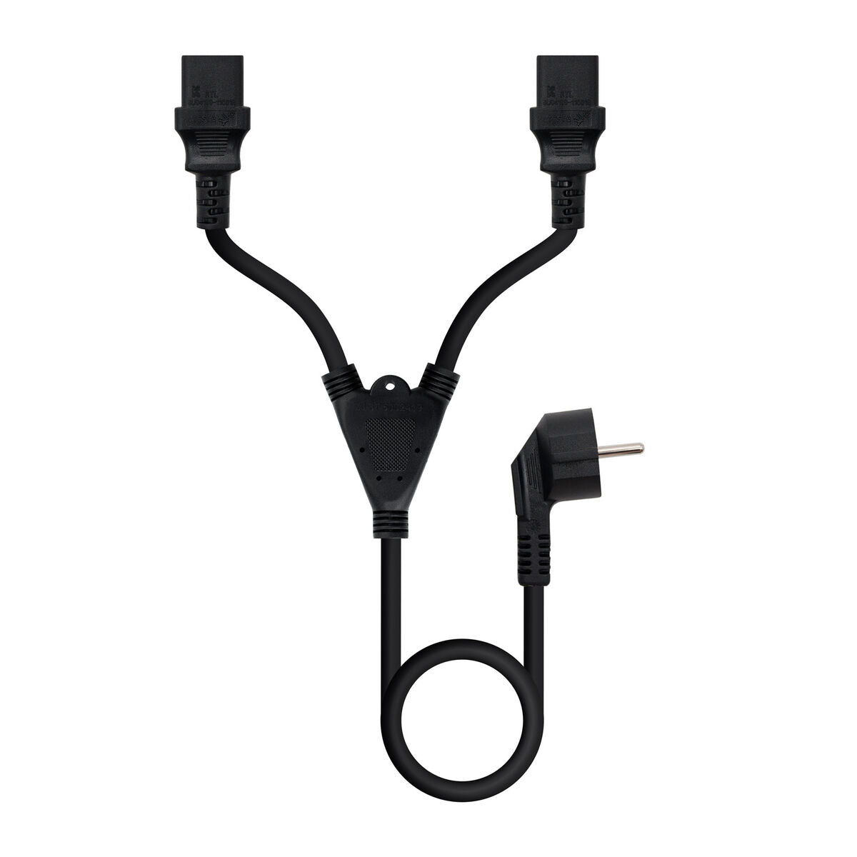 Conector CEE7 macho en un extremo y dos conectores C13 hembra en los otros.