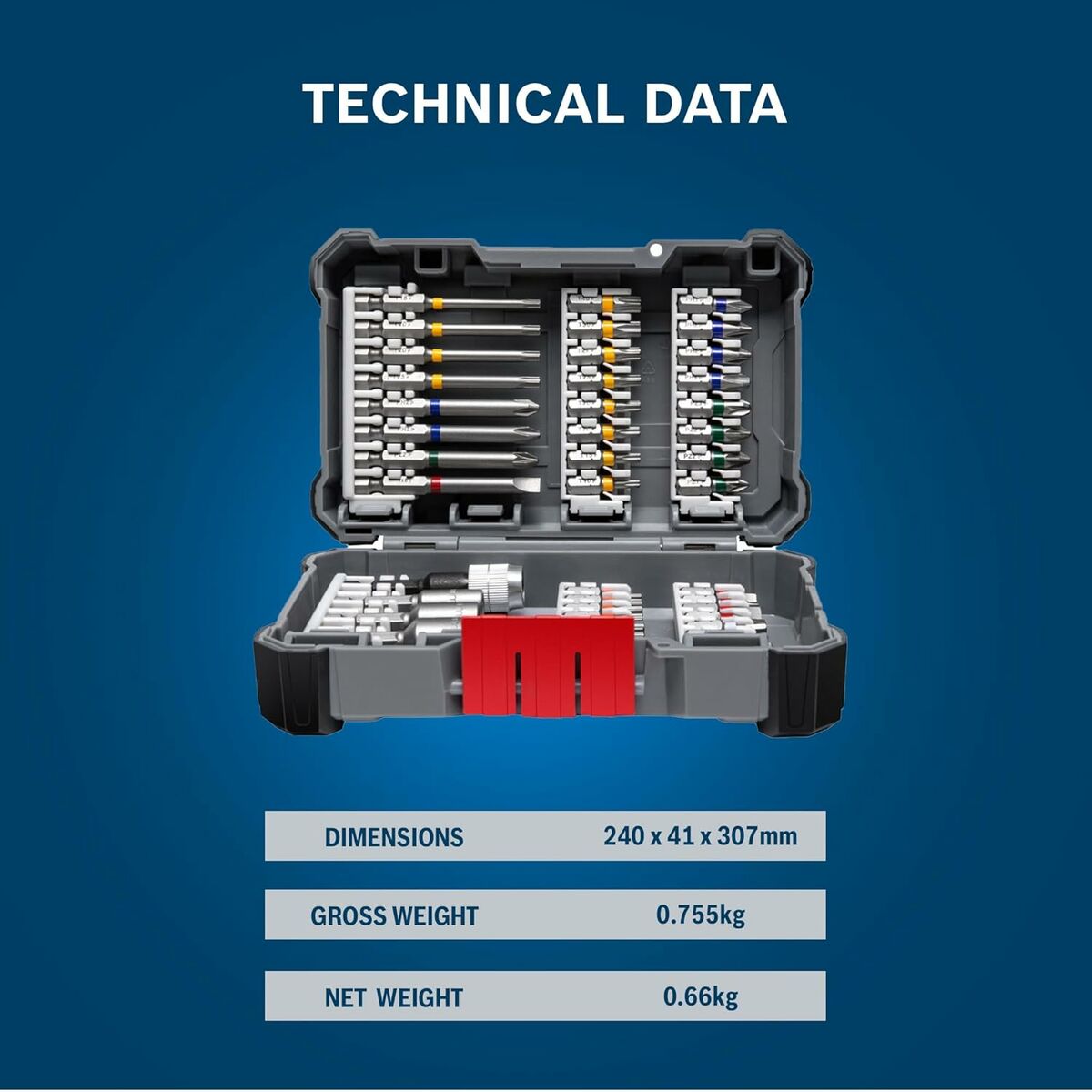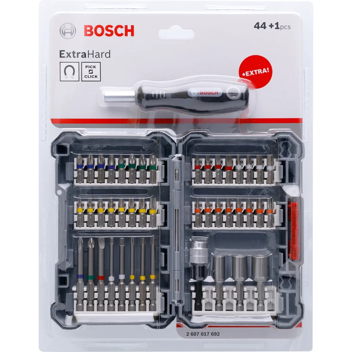 Bosch 2 607 017 692. Número de bits: 45 pieza(s), Desatornillador/puntas incluidas: Plano, Hexagonal (métrico), Plaza, Torx, Brocas para destornillador Philips: PH 1, PH 2, PH 3, PH 4. Longitud: 65 mm, Ancho del paquete: 240 mm, Profundidad del paquete: 41 mm. Tipo de embalaje: Caja