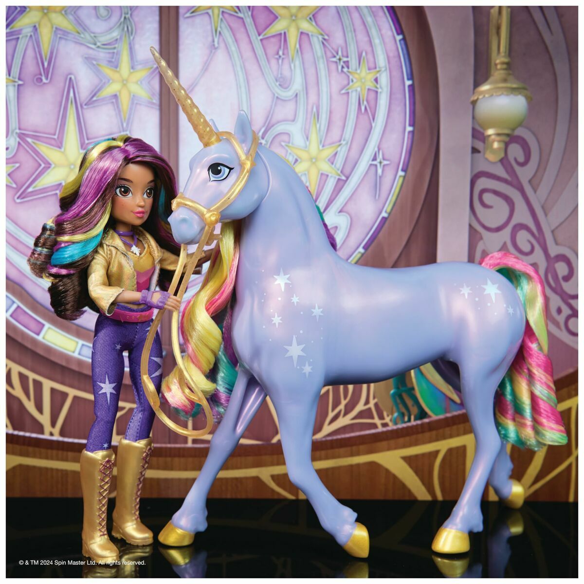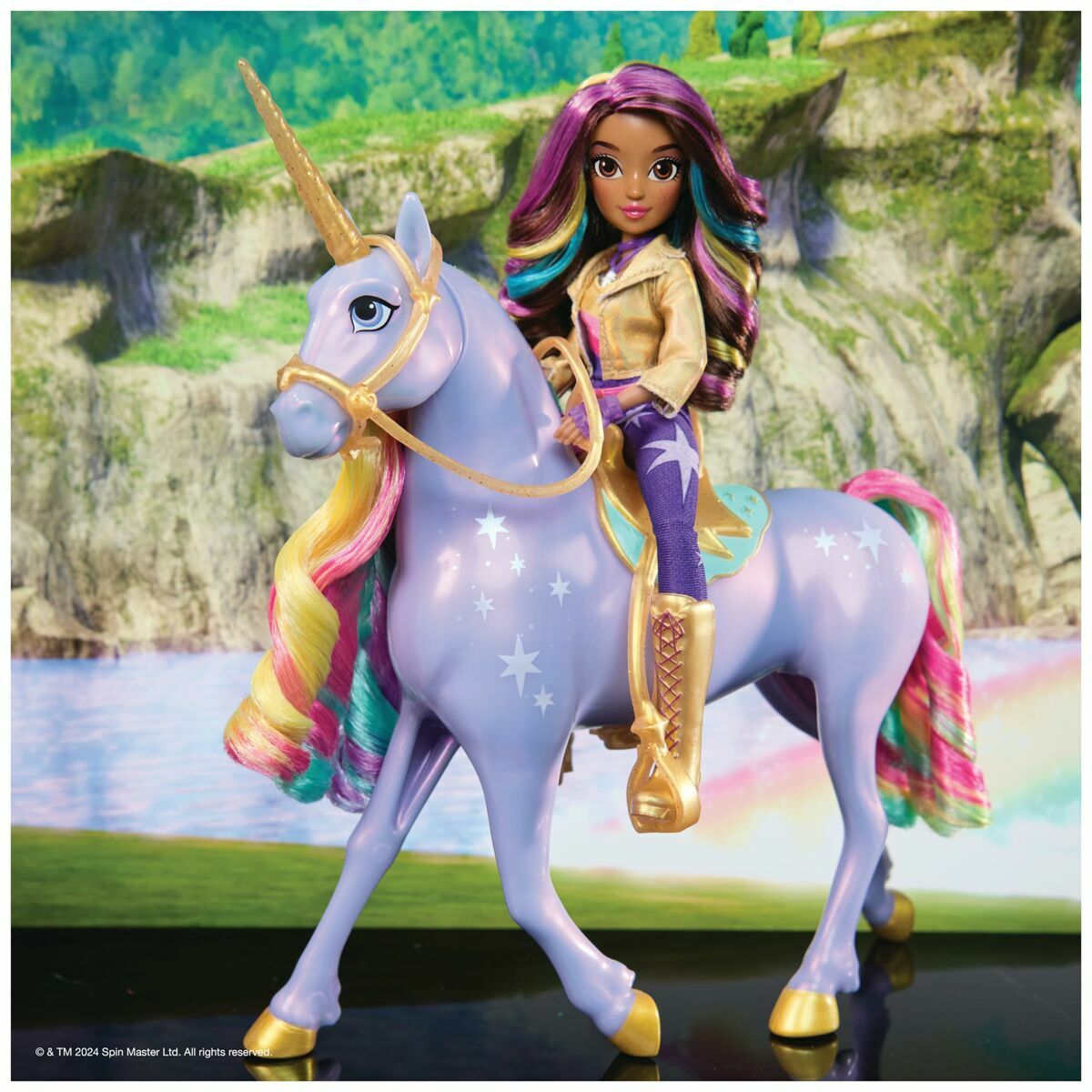 Descubre tu destino con Sophia & Rainbow Light-up Wildstar de Academia Unicornio. Inspirada en la serie de animación de NETFLIX y los libros superventas, las niñas puedan recrear el momento de vinculación mágica de la serie con esta unicornio interactiva de 28 cm de Estrella y la muñeca de 24 cm de Sophia. Estrella reacciona cuando la tocas con luces de arcoíris, efectos de sonido y canciones de la serie. Acaricia la cara de Estrella, toca su cuerno y tira de las riendas para ver cómo reacciona. A medida que el vínculo se fortalezca, las marcas de magia de luz blancas y el cuerno de Estrella brillarán más intensamente y adquirirán los colores del arcoíris cuando te hayas ganado su confianza. Presiónale la cara para completar el vínculo y escucha cómo Estrella lo celebra con la canción de la serie. Después, podrás presionar la cara de Estrella para volver a reproducir la música o tocar el cuerno para ver la luz guía, entre otras actividades. Coloca a Sophia sobre la unicornio y cabalga hacia la aventura. Amplía tu universo de Academia Unicornio con las muñecas y los unicornios (se venden por separado). Para niñas a las que les gustan los juguetes de unicornios y caballos, las muñecas y los accesorios, las casas de muñecas, los juguetes coleccionables o los peluches, entre otros. Los juguetes de Academia Unicornio son un divertido regalo para cumpleaños o cualquier otra ocasión. Incluye 2 pilas AA y tiene canciones instrumentales y en inglés. Experimenta algo fuera de lo común con Sophia & Rainbow Light-up Wildstar.