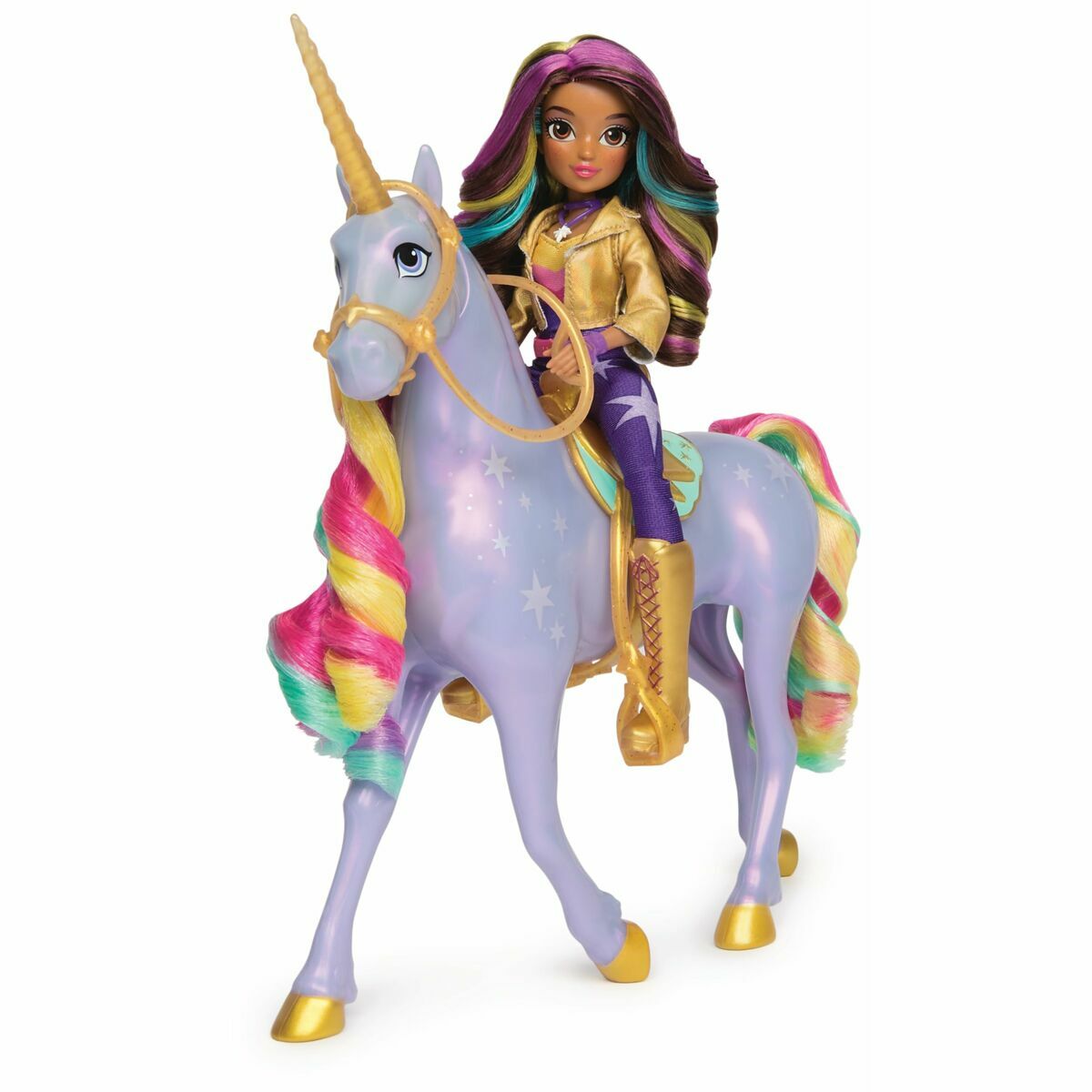 Contenido: 1 unicornio, 1 muñeca, 1 montura extraíble, 1 brida extraíble, 6 piezas de moda extraíbles, 1 herramienta de peinado, 1 guía de inicio rápido, 1 guía de instrucciones