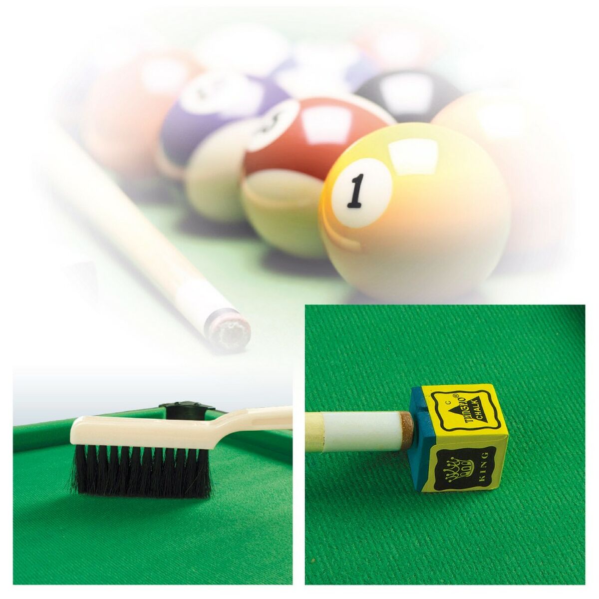 - Contiene 21 piezas: 15 bolas de color (7 rayadas y 8 lisas), 1 bola blanca, 2 palos de madera, 1 cepillo, 1 taco y 1 triángulo