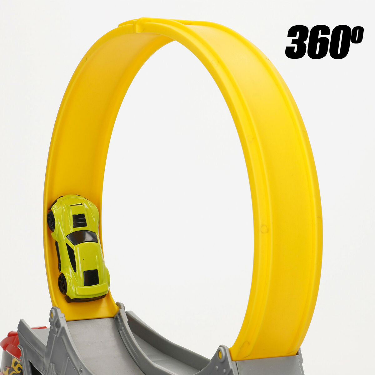 - Incluye: camión gigante de transporte, coche metálico die-cast, pista con looping y rampa ajustable