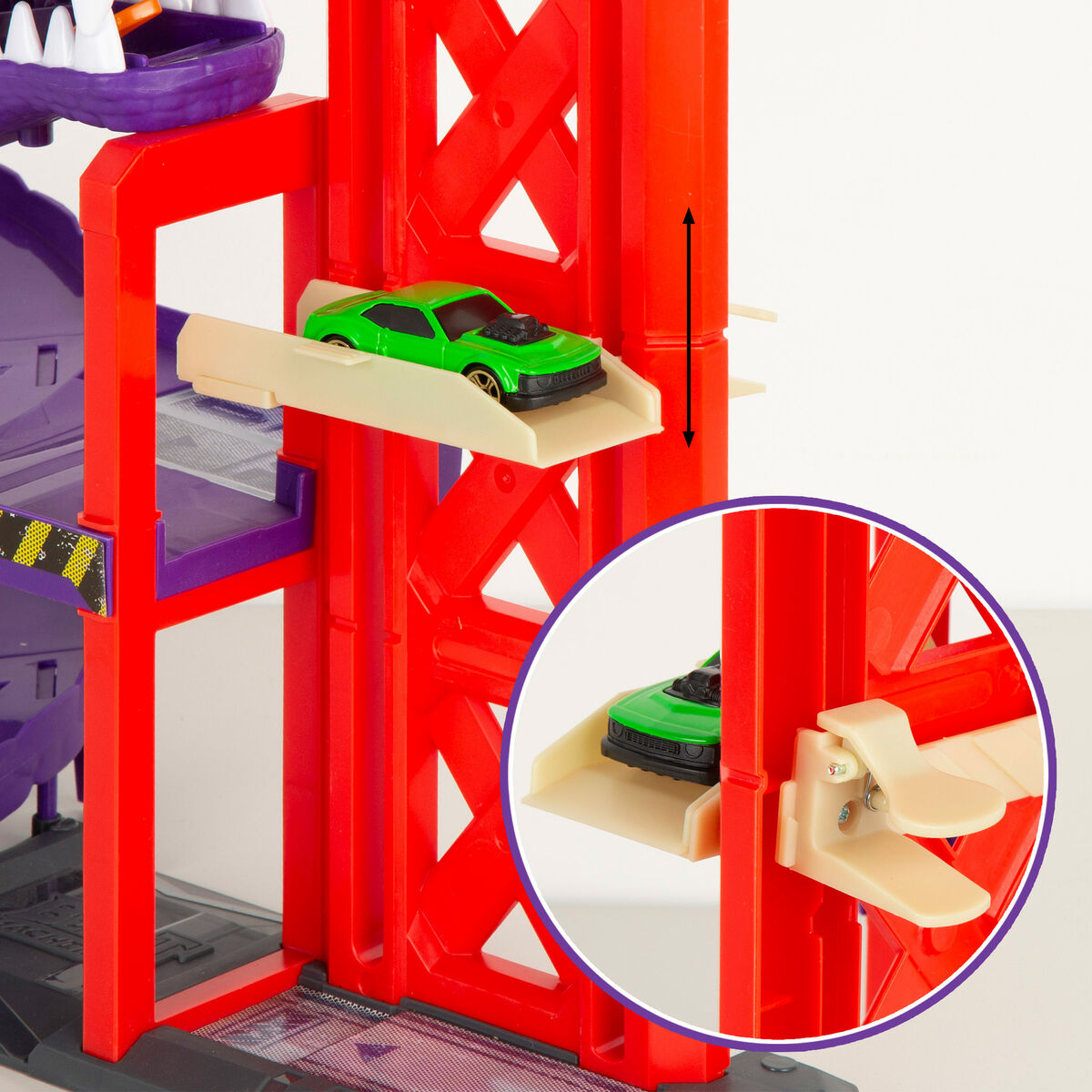 - Incluye: el garaje dinosaurio con feroces dientes, incluye 1 coche de carreras perfecto para poder disfrutarla desde el primer momento