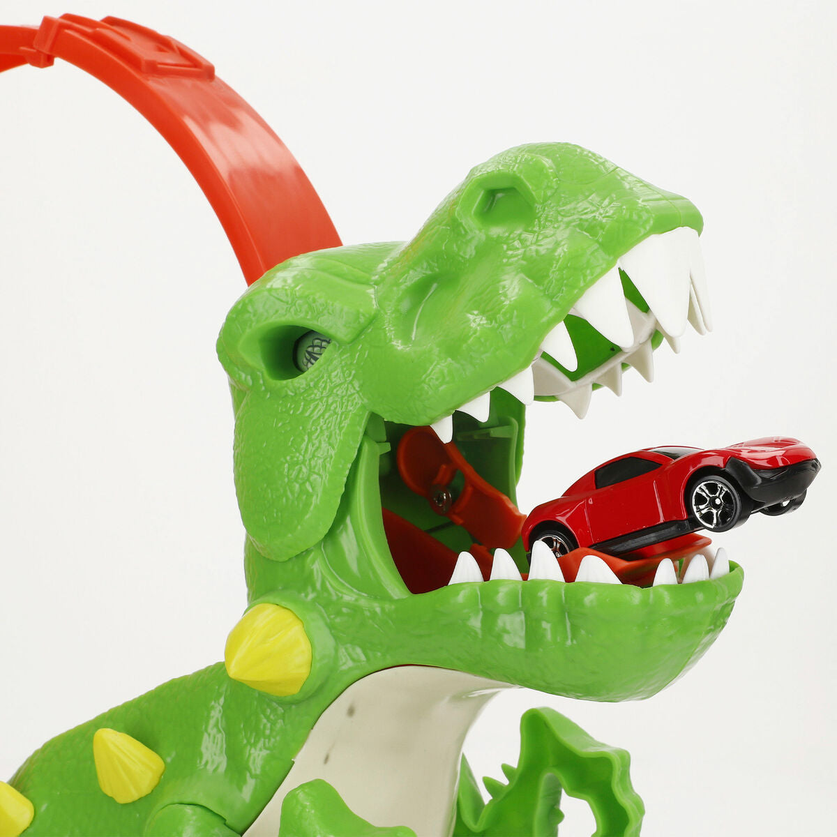 - Incluye: pista con lanzador manual, figura de dinosaurio y 1 coche metálico die-cast