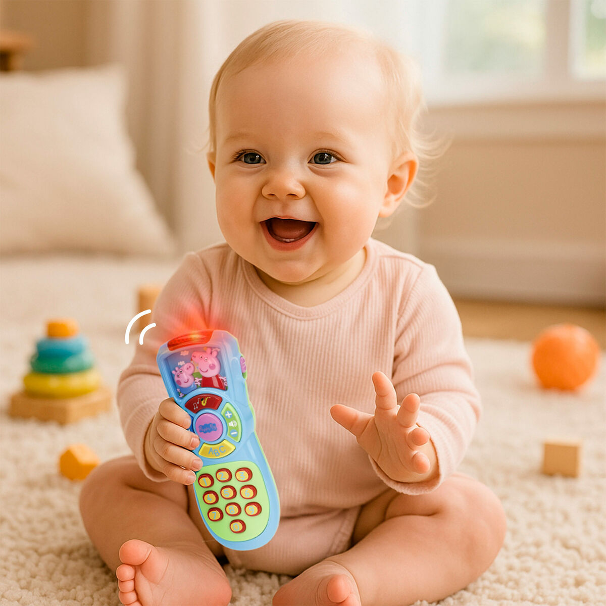 - Luz, sonido y texturas: el mando de juego incluye botones de distintas formas, colores y texturas, algunos de ellos con sonidos; el mando a distancia cuenta con botones numéricos que activan sonidos, luz y la melodía de Peppa Pig al pulsarlos (funcionan con 2 pilas AAA incluidas)