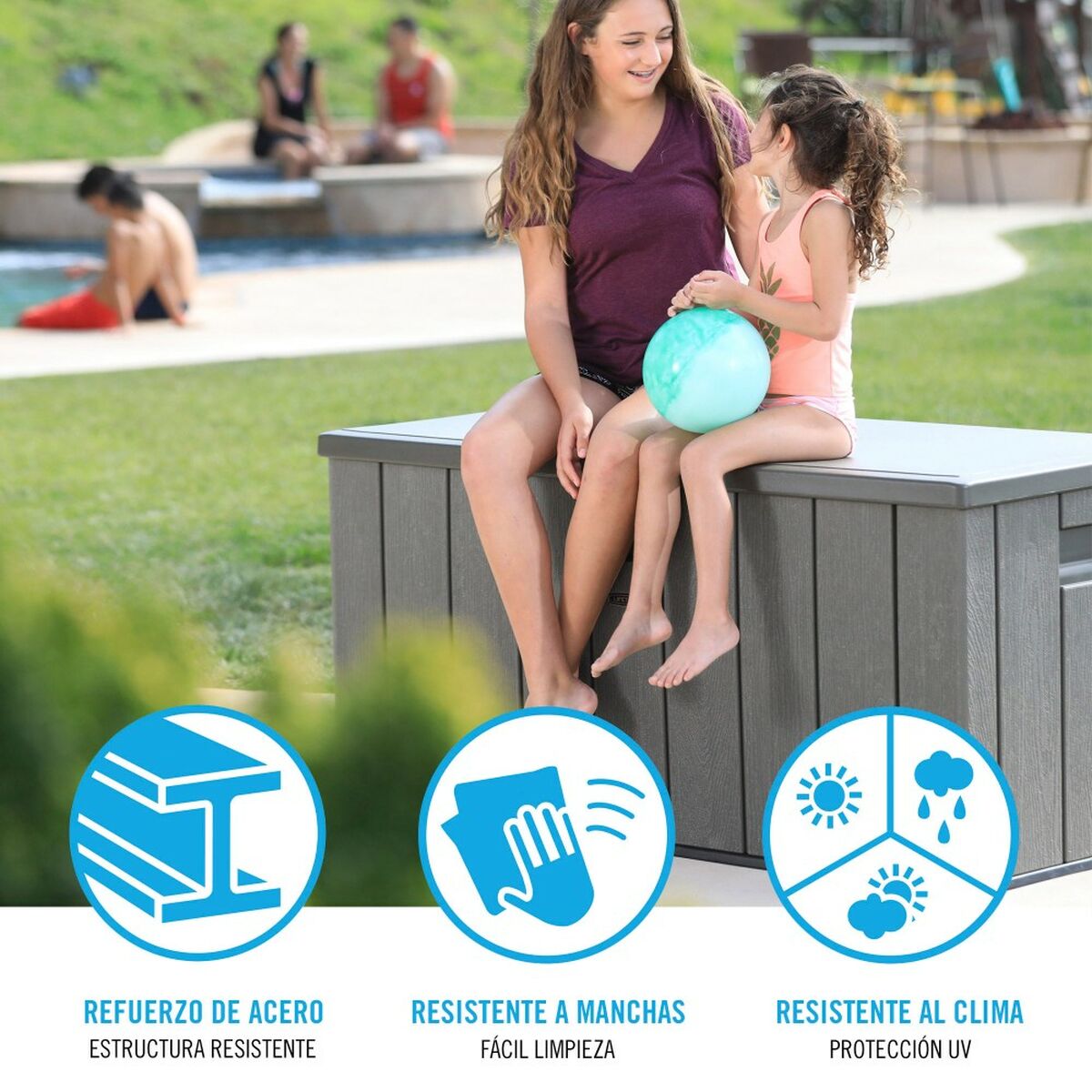- Robusto y duradero, se puede cerrar con candado gracias a la lengüeta de cierre exterior, la puerta es abatible y dispone de asas laterales, sirve como asiento