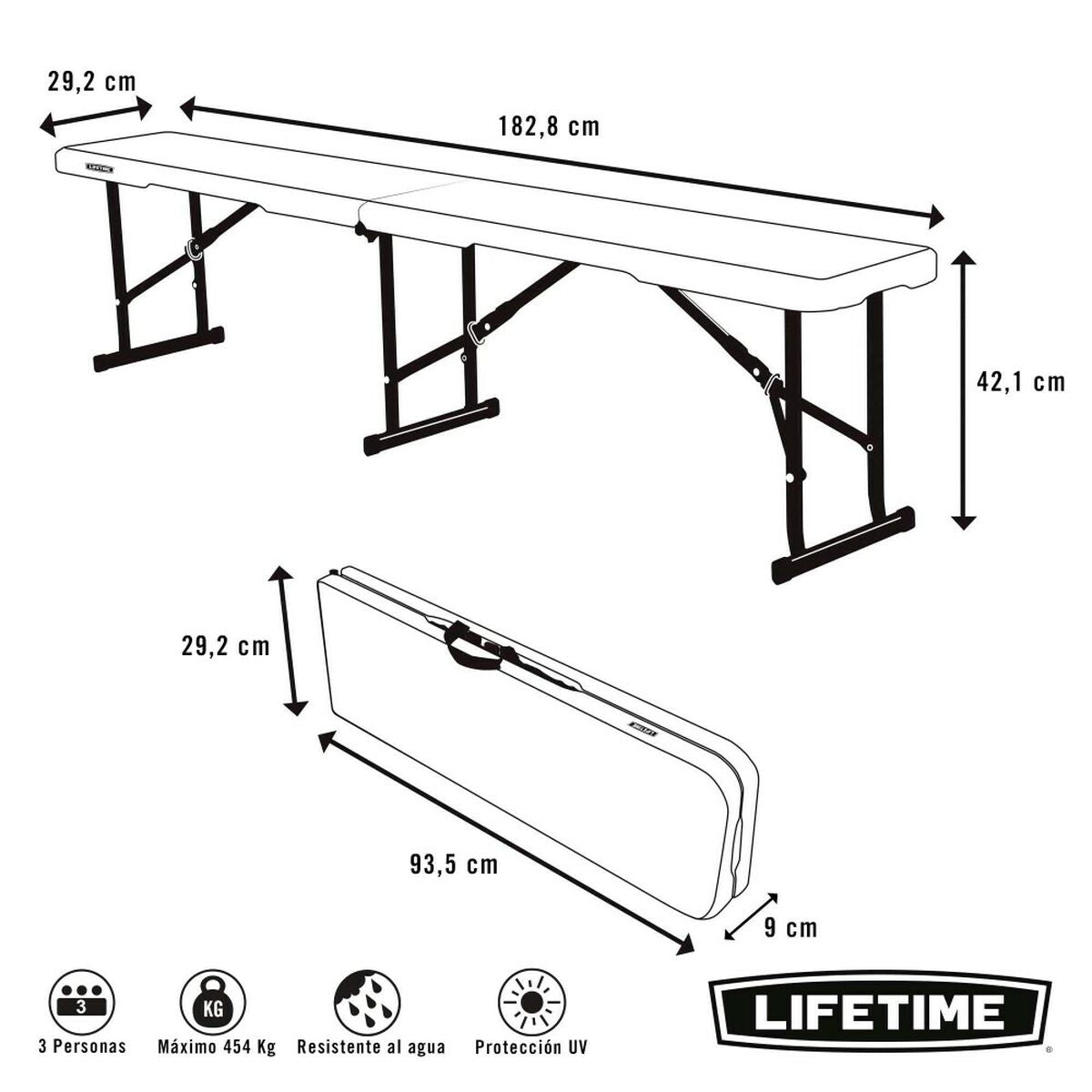 Banco plegable por la mitad LIFETIME de polietileno de alta densidad con protección UV. Estructura de acero con revestimiento en polvo antióxido. Ideal para exterior e interior, como asiento de mesa o para cualquier actividad, alta resistencia a la intemperie. Ligero (7 Kg), compacto y con asa de transporte. Medidas abierto: 183x29x42 cm, cerrado: 93,5x29x9 cm, peso máximo soportado: 454 Kg.