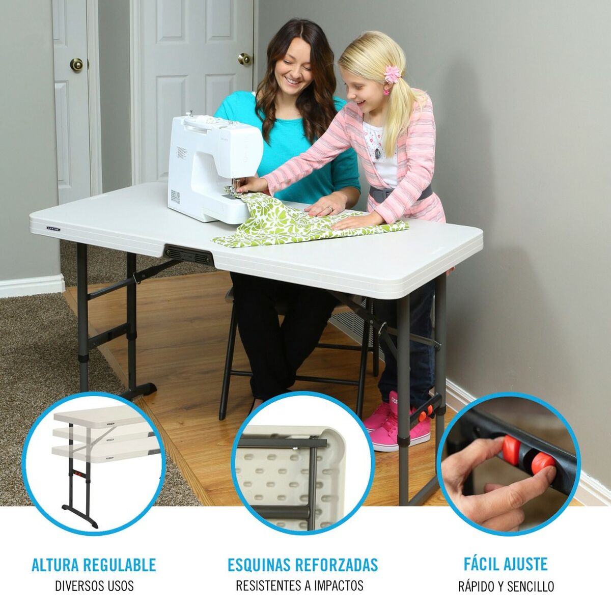 Mesa ajustable altura y patas abatibles Lifetime color crema. Tablero de polietileno de alta densidad con protección UV y estructura robusta de acero con revestimiento en polvo antióxido. Medidas: 122 x 61 cm; altura ajustable con una sola mano: 61-86 cm. Tiene asa de transporte, anclajes de seguridad en las patas y topes de goma protectores para proteger el suelo. Duradera, resistente y ligera (11 kg), ideal para 4 personas.