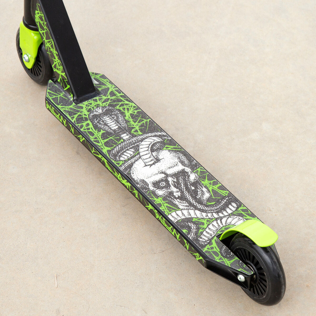 - Diseño deportivo: patinete en color negro y verde de 2 ruedas con freno trasero de pie y superficie y puños antideslizantes. Mide 62x45x79 cm